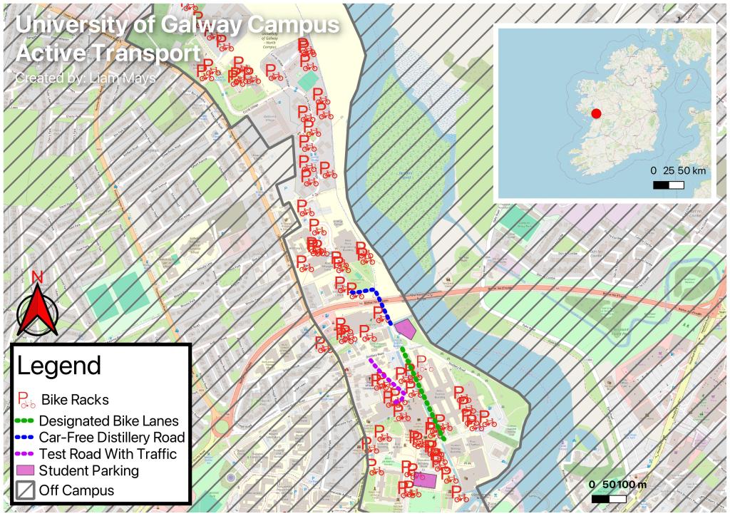 Areas around the central points of this research can give more context to better understand campus transportation patterns. For instance, there is only one identifiable bike lane on the University of Galway campus, which means cyclists are frequently sharing space with either pedestrians or vehicles, which creates safety concerns.
